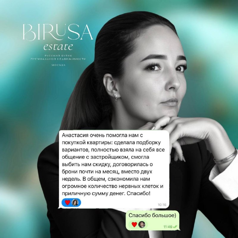 Хотя правильнее сказать — бирюза 👏 (BIRuSA estate). Это был её первый кейс в недвижимости. И сразу — сложный. Анастасия — уже давно в бизнесе, работает с 18 лет, руководит большой командой в других сферах - в розничной торговле и в сфере организации мероприятий. Поэтому переговоры, ответственность за результат, работа с людьми — её привычная среда. Но рынок недвижимости — другая вселенная, здесь нужно брать ответственность за миллионные бюджеты клиентов. Ольга (автор отзыва и наша клиентка) начала с нами работать уже после опыта самостоятельных поисков. А это почти всегда классический сценарий: усталость, сомнения и ощущение, что «нормальных вариантов уже нет». Когда человек сначала ищет квартиру сам, обычно происходит одно из двух: → либо лучшие условия уже ушли, время потеряно; → либо клиент уже обращался к застройщику напрямую, и поэтому для него больше не действуют специальные предложения и выгодные условия. И на старте задача у нас выглядела почти невозможной: — семейная ипо