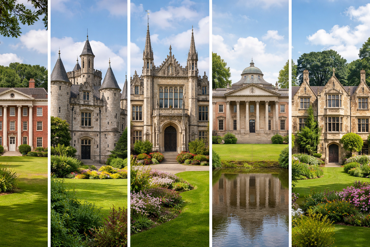 Фасады чаще выполняются из красного кирпича с белыми каменными или оштукатуренными деталями (stone dressings), что создаёт характерный контраст. Композиция рациональна и монументальна, но без барочной перегруженности. В интерьерах сохраняется классическая иерархия пространств (центральный холл, парадная лестница, анфиладная логика), при этом планировка становится более функциональной и ориентированной на комфорт XX века.