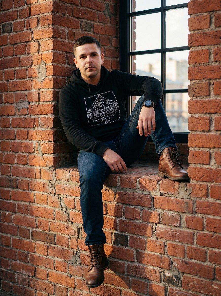 🤖Генерировать можно здесь: 👉БОТ ДЛЯ ГЕНЕРАЦИИ Режим Nano Banana Pro 4К ИНСТРУКЦИЯ Молодой мужчина с загруженного фото. Черты лица, форма глаз, цвет волос и общий облик мужчины строго перенесены с загруженного референсного фото - точное сходство обязательно. Смотрит прямо в камеру с уверенным, немного задумчивым выражением лица. Он одет в чёрный худи с белым графическим принтом (геометрический узор), тёмно-синие джинсы и коричневые кожаные ботинки на шнуровке. На левом запястье — черные спортивные часы. Сидит на кирпичной стене, одна нога свисает, другая согнута в колене, рука лежит на колене — поза расслабленная, но осознанная. Фон — старая красная кирпичная стена с текстурой, видны швы и небольшие трещины. В верхнем правом углу — часть окна с чёрными металлическими решётками, за ним — мягкий дневной свет и размытый городской пейзаж. Освещение — естественный дневной свет, мягкое солнце сбоку, создающее тёплые тени и контрастные блики на лице и одежде. Ракурс камеры — чуть снизу, по