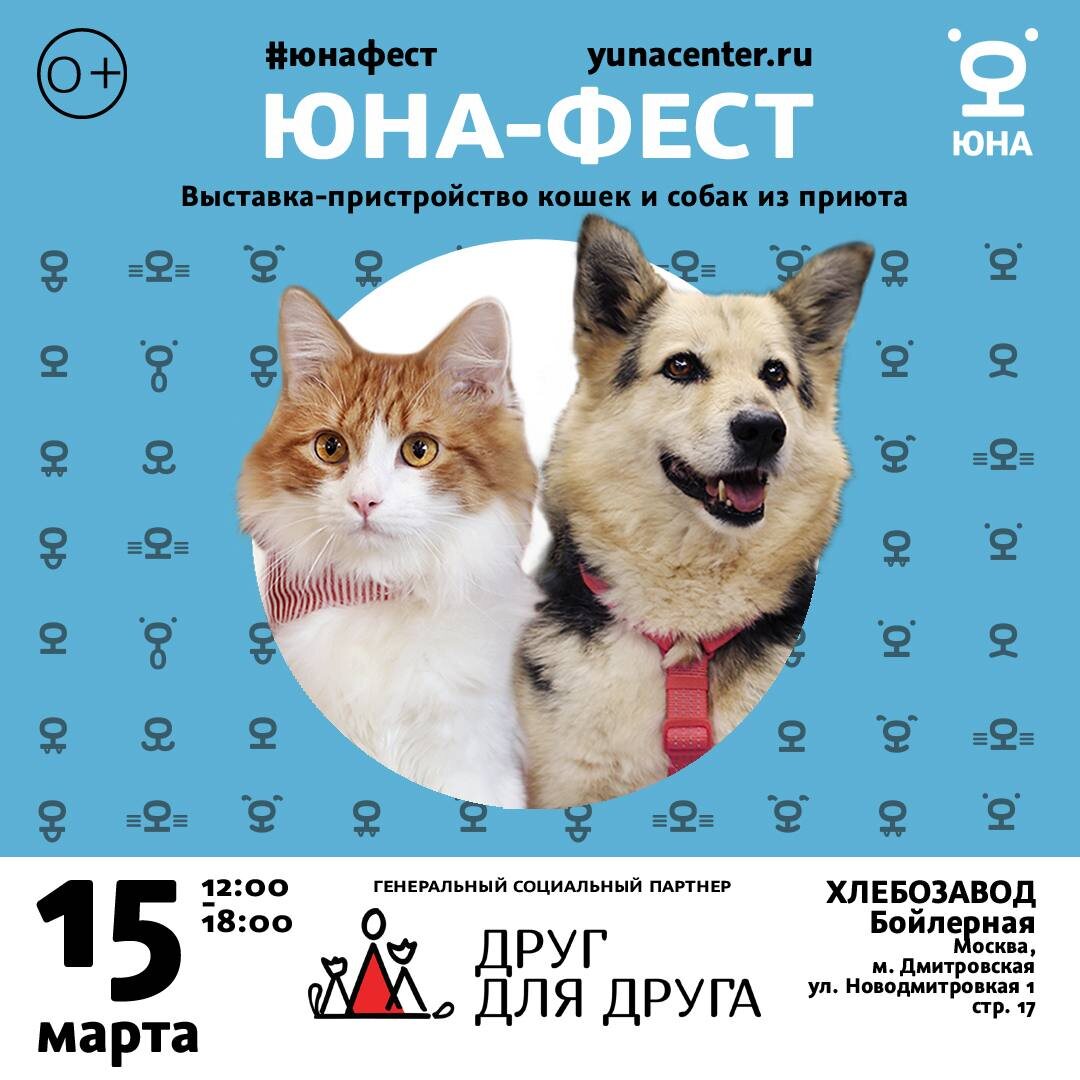 Мечтаете о пушистом друге или просто хотите провести день с улыбкой и пользой? Тогда отмечайте в календаре: 15 марта, с 12:00 до 18:00, на Хлебозаводе состоится «Юна-Фест» — большая выставка-пристройство кошек и собак из приюта!😛 Это ваш шанс! Более 70 очаровательных кошек и 40 замечательных собак будут ждать вас на Фесте 💐 Среди них точно есть ваш идеальный спутник – любого возраста, внешности и характера! 📎Почему стоит прийти? 🟡Все животные привиты, чипированы и имеют документы. 🟡Отдаются БЕСПЛАТНО после беседы с зоопсихологом. 🟡Каждый новый хозяин получит подарки для адаптации питомца. 📎Но это еще не всё! «Юна-Фест» — это настоящий праздник для всей семьи: 🔵Интерактивные игры, лекции и мастер-классы от проекта «Друг для Друга». 🔵Благотворительная лотерея от TECNO с крутыми призами. 🔵Аквагрим, творческие станции, благотворительный маркет и вкуснейший фудкорт! 🫂Сделайте доброе дело: прихватите с собой подарки для тех, кто пока остается в приюте – корма, игрушки, лекарства.