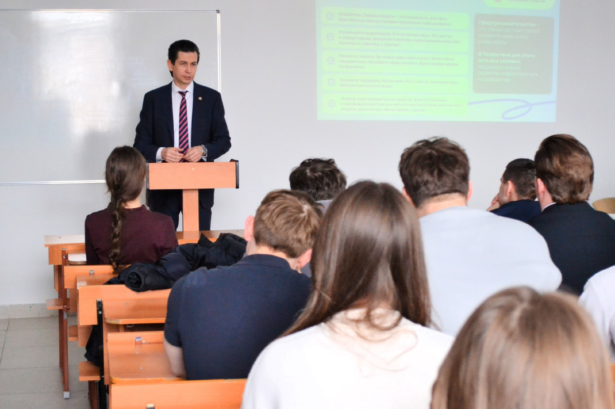 Сегодня Уполномоченный при Раисе Республики Татарстан по защите прав предпринимателей Фарид Абдулганиев провел традиционную встречу со студентами кафедры государственного и муниципального управления Института управления, экономики и финансов Казанского федерального университета. В ходе встречи бизнес-омбудсмен РТ рассказал о возможностях для ведения молодежью предпринимательской деятельности, какие меры поддержки государство им предлагает и какие есть механизмы защиты законных прав и интересов предпринимателей в Татарстане. В начале встречи Фарид Абдулганиев поделился личными воспоминаниями: он сам является выпускником этой кафедры, и именно здесь начинался его путь в профессии. Обращаясь к студентам, бизнес-омбудсмен РТ пожелал им максимально использовать время учебы в вузе для получения знаний и навыков, которые пригодятся в жизни, независимо от выбранной траектории — будь то государственная служба или собственный бизнес. Основная часть лекции была посвящена практическим вопросам: с