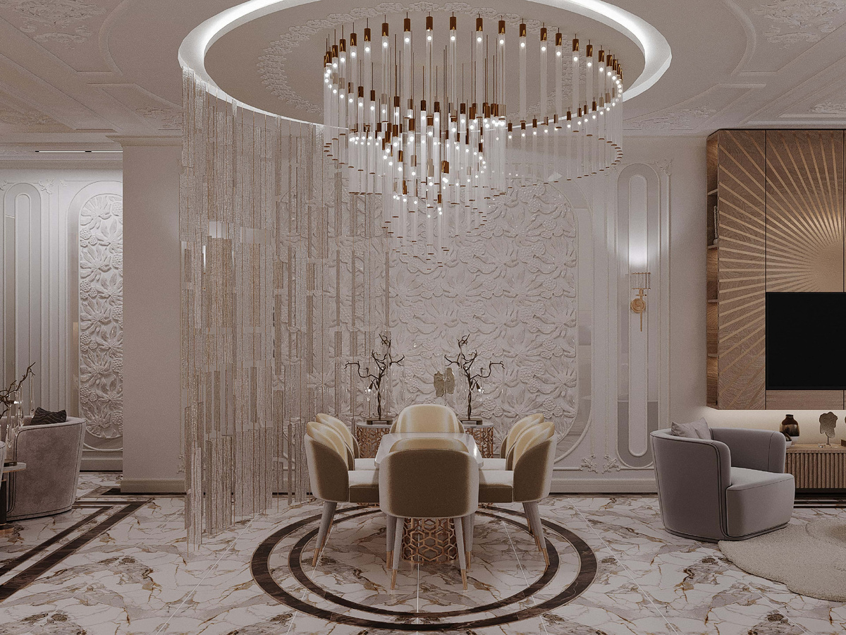 Середину комнаты занимает парадная столовая. Для этой зоны наши дизайнеры придумали эффектное обрамление в виде воздушной перегородки из стеклянных подвесок. Оформление потолка повторяется в отделке пола. Плавные скруглённые линии продолжаются в дизайне обеденной группы. Ажурное основание стола из золотистого металла рифмуется с консольным столиком у стены.