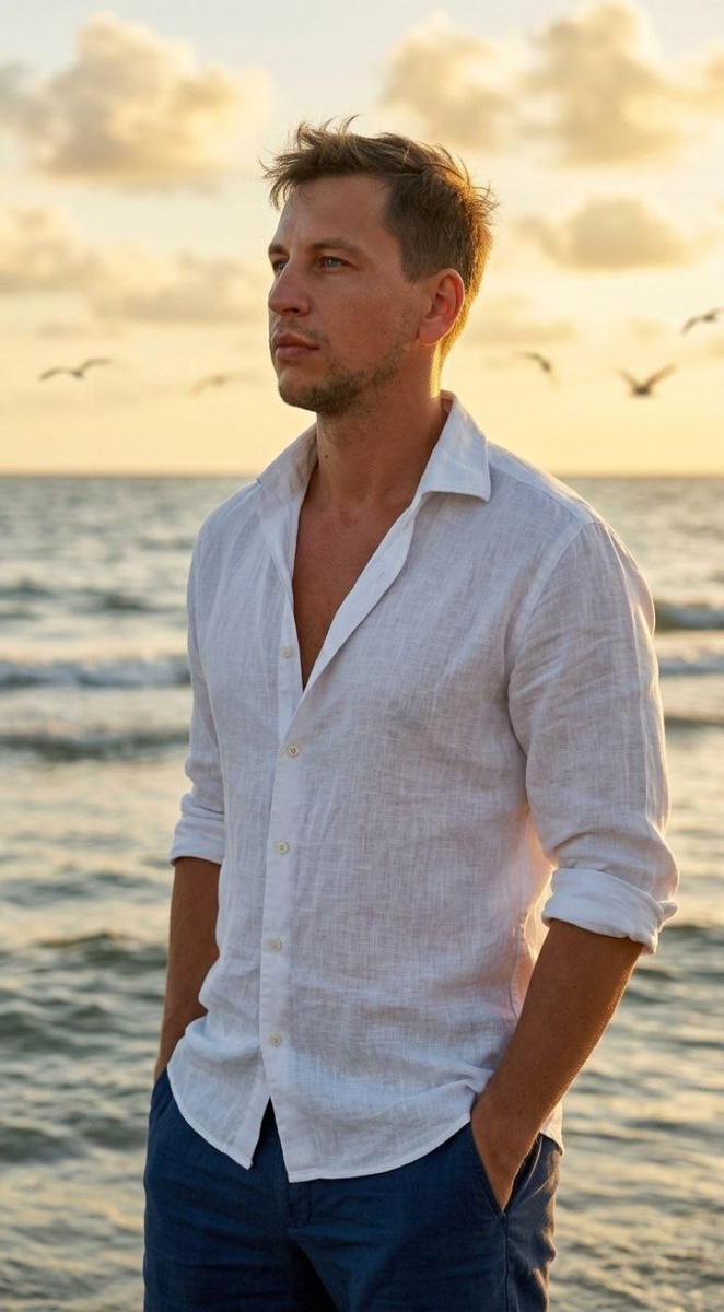 Не меняя внешности мужчины с фото, он в расслабленной задумчивой позе, боком к камере, слегка повернув голову вверх, словно вглядываясь в даль. На нём белая лёгкая льняная рубашка с закатанными до локтей рукавами и широким открытым воротником, через который видна загорелая грудь, подчёркивающая непринуждённость. Рубашка простегана текстурой льна, свободно облегает торс, акцентируя мускулатуру; тёмно-синие брючные шорты плотно сидят, руки в карманах, создавая спокойствие. Короткие волосы слегка взъерошены бризом, придавая динамику. На фоне — спокойное море с лёгкими волнами при тёплом закатном свете, золотистый свет подчёркивает скулы и линию челюсти. Небо с пушистыми жёлто-оранжевыми облаками добавляет умиротворение. Вдали летают силуэты чаек, оживляя сцену свободой, типичной для морского пейзажа на закате. Композиция с естественным освещением, гармонией человека и природы, кинематографическая глубина, фоторалистичное изображение, высокая текстурная детализация, 8K.
