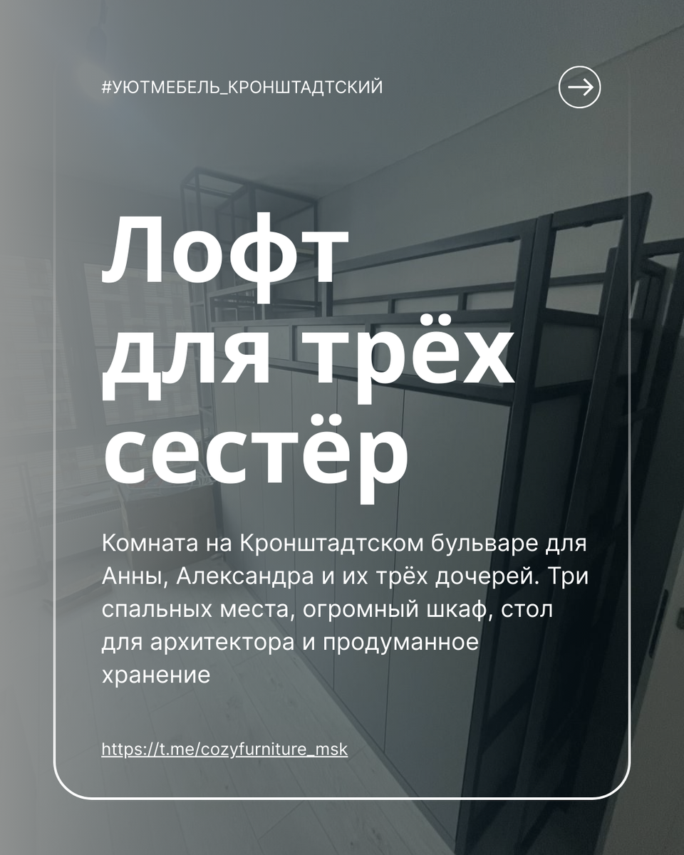 Металл, серый Egger, двухъярусная кровать и стол для будущего архитектора — рассказываем о проекте Анны и Александра Когда в семье трое детей, комната превращается в многофункциональное пространство, где нужно совместить сон, учёбу, хранение и личное пространство для каждого. К нам обратились Анна и Александр с задачей: сделать комнату для трёх дочерей на Кронштадтском бульваре. Главные требования — вместительность, эргономика и стиль, который не надоест через год. Мы предложили концепцию лофта с открытым металлическим каркасом, спокойным серым фоном и продуманной геометрией. Рассказываем, что получилось. Комната должна была вместить три спальных места, систему хранения для одежды и вещей, а также полноценную рабочую зону. При этом нельзя было загромождать пространство — важно оставить место для игр и общения. Мы разделили комнату на функциональные зоны: Двухъярусная кровать — классическое решение для экономии места. Мы сделали её на металлическом каркасе из профиля 30×30 мм с чёрным м