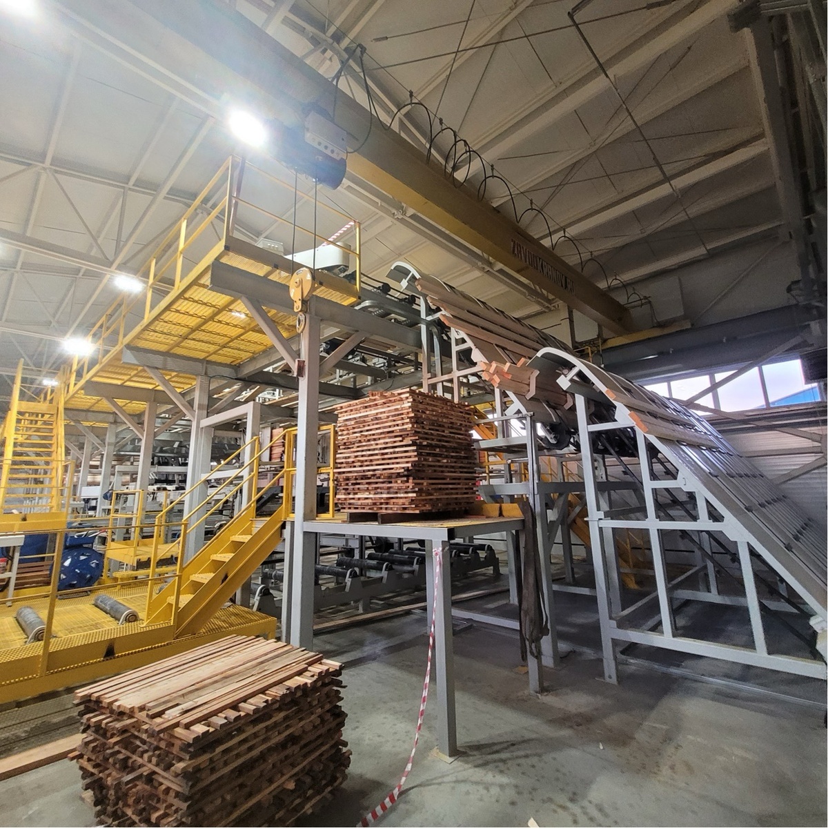 1. На средних и крупных лесопильных заводах процесс сортировки по породам сортам и сечениям досок занимает одно из основных мест по значимости, времени и количеству занятых работников. Производительность и точность линии сортировки досок напрямую влияет на продажу и отгрузку продукции позволяет детализировать доску для дальнейшей продажи как внутри страны, так и за рубеж. Автоматизация подобного процесса намного ускоряет и облегчает работу предприятия, а также помогает вести более точный учет без «человеческого фактора». 2. Подача пакетов сырой или сухой доски на линию происходит при помощи разборщика пакетов. Послойно доски попадают на каскад горок с цепным контурами, подающих пиломатериал на высоту 6 метров. Конструкция горок и лопаток на цепях позволяют забирать доски на ребре поштучно, тем самым упрощая дальнейшую работу сортировки. 3. На верхнем этаже происходит сгон доски на базовую сторону при помощи свинчивающего рольганга. Затем происходит оценка пиломатериала по качеству, сеч