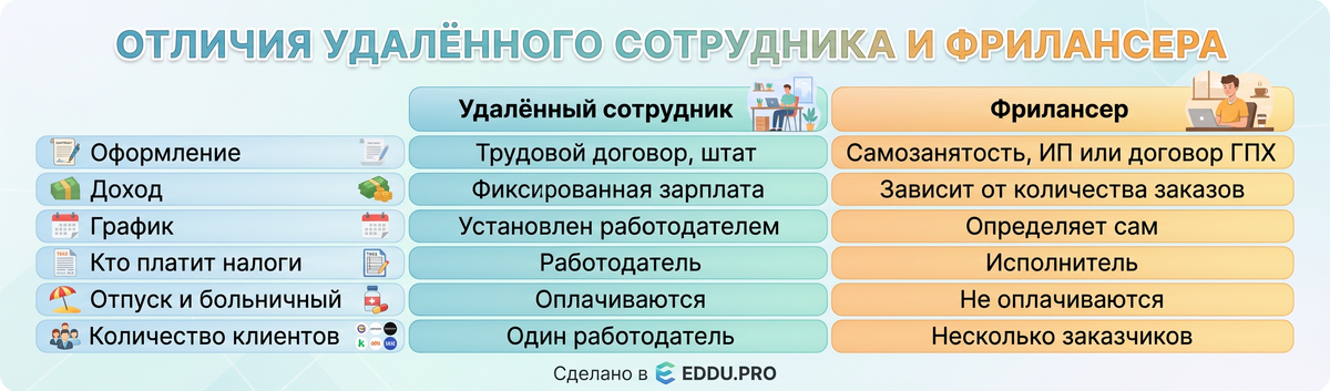 Фрилансер может сотрудничать с одной крупной компанией на долгосрочном проекте или параллельно вести несколько небольших заказов. Главное — он свободен в принятии решений, но и всю ответственность несёт сам.