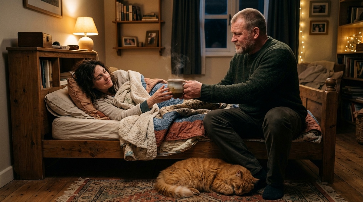 Виктор сел на край кровати. Смотрел, как она пьёт. Это могло бы быть неловко — болеть при другом человеке, когда ты бледная и растрёпанная, и пьёшь бульон маленькими глотками, потому что больше не можешь. Но почему-то не было неловко.
