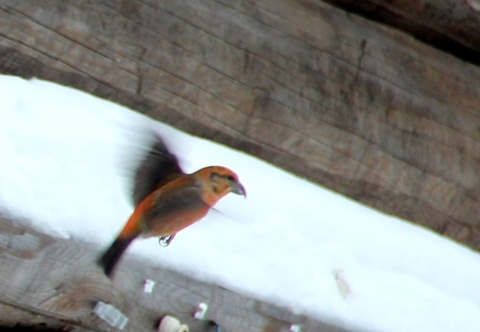 По утрам стайки клестов прилетают к домам в посёлке Рустай. Самцы с ярким красным оперением сидят на деревьях и громко перекликаются, привлекая самок.