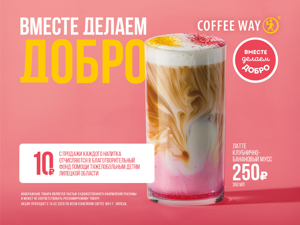 Кофейни Coffee Way — это места, где люди начинают свое утро, встречаются с близкими, берут паузу среди рабочего дня. Каждый день через точки проходят десятки тысяч людей. И команда бренда понимает: такой масштаб — это возможность сделать что-то важное вместе с вами. С теми, кто приходит за кофе каждое утро. Именно поэтому Coffee Way запустили особенный напиток — латте «Клубнично-банановый мусс». С каждой проданной чашки 10 рублей перечисляются в фонд «Вместе делаем добро» в помощь тяжелобольным детям Липецкой области.* Фонд «Вместе делаем добро» работает для детей, которым нужна помощь прямо сейчас. Каждый год фонд поддерживает более ста семей, оказавшихся лицом к лицу с тяжелой болезнью. Лечение, реабилитация, лекарства, оборудование — все это стоит денег, которых у семей часто просто нет. Потому, когда вы покупаете латте «Клубнично-банановый мусс», 10 рублей от его стоимости уходят в фонд. Десять рублей — сумма, которую мы не замечаем. Но сто чашек — это уже тысяча. Тысяча чашек — эт