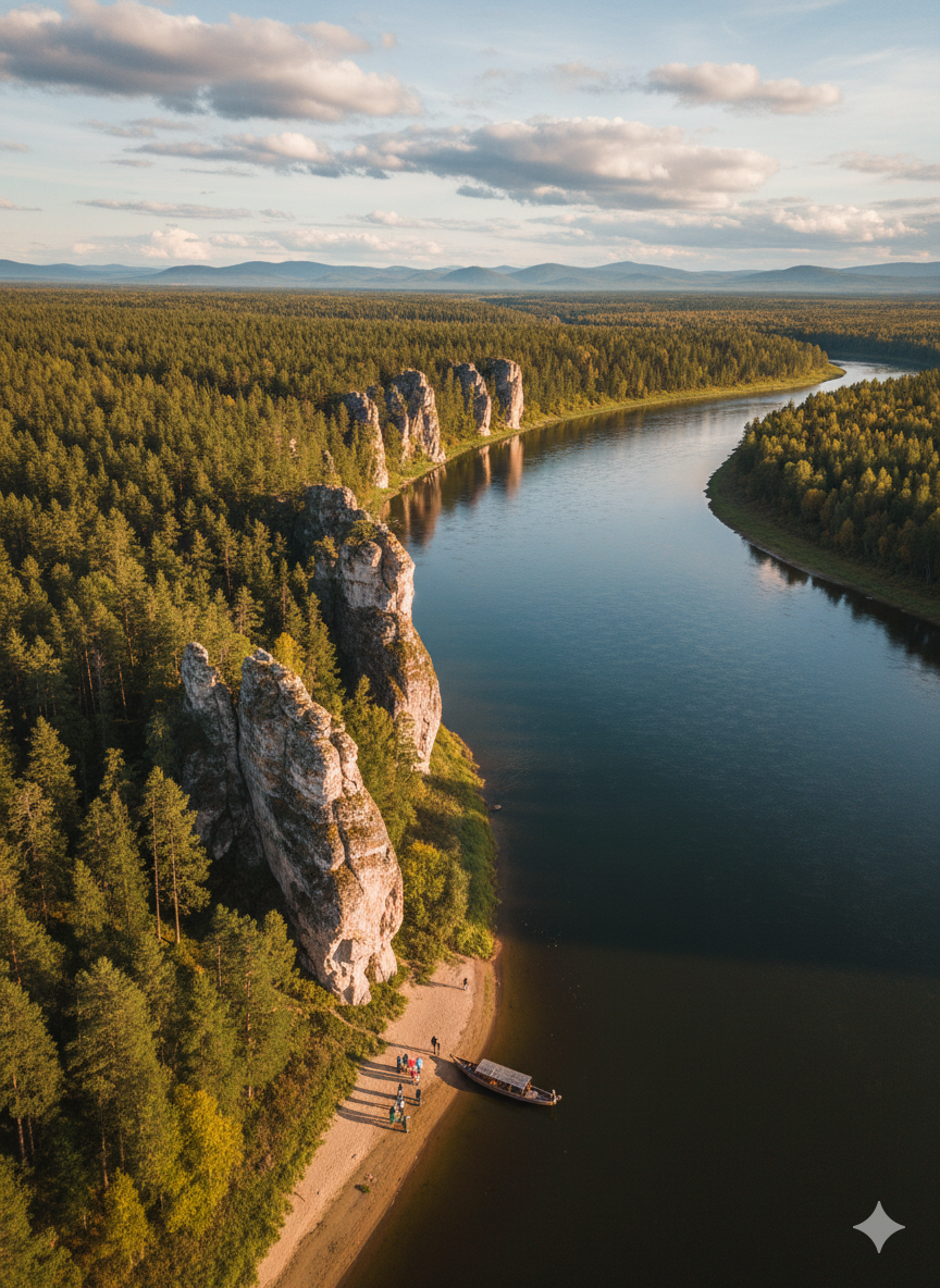 - Как добраться: из Якутска на теплоходе по Лене (около 200 км) или на автомобиле через Вилюйский тракт + частный катер; организованные туры от 7 000 руб. с человека.
