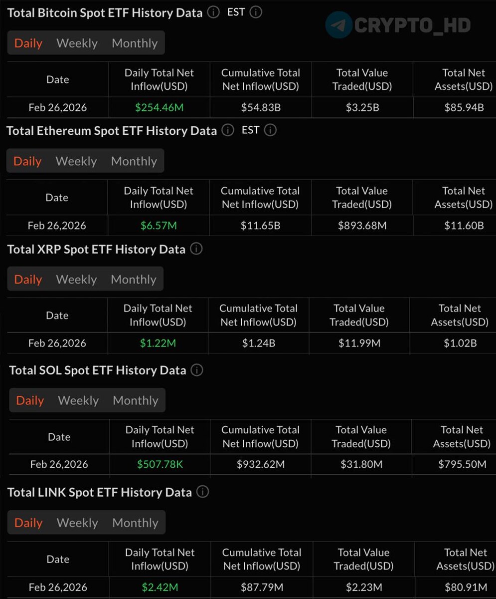 Финпотоки за вчерашний день: ▫️#BTC = +$254,460,000 (3 зеленых дня подряд). ▫️#ETH = +$6,570,000 (3 зеленых дня подряд). ▫️#XRP = +$1,220,000. ▫️#SOL = +$507,780. ▫️#LINK = +$2,420,000. ▫️#DOGE, #LTC, #AVAX и #HBAR = $0. Вчера: переводы BlackRock Crypto Headlines