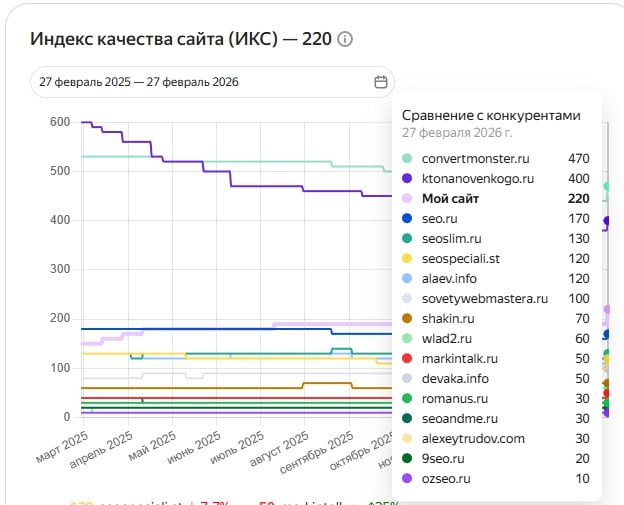 Что заметил по разным проектам/нишам: ✅ где полгода ничего не делали — чаще всего ИКС остался примерно на месте; ✅ где дожимали техничку, чистили индекс, приводили страницы в порядок — есть ощутимые плюсы; ✅ где расширяли семантику и делали посадочные под спрос — рост заметнее и стабильнее, иногда прямо «выстреливает» относительно конкурентов. По моим наблюдениям, сильнее всего на ИКС влияют: 1️⃣ Техничка и качество индекса Идеально «вылезанный» индекс нередко даёт +10–20 ИКС просто за счёт нормальной базовой гигиены. 2️⃣ Запросный индекс (семантика + релевантные страницы) Расширение спроса через правильные посадочные может качать показатель на ~20–30% — потому что сайт начинает закрывать больше интентов. 3️⃣ ПФ, особенно возвраты в выдачу Чем меньше людей возвращаются назад в поиск, тем выше доверие к ответу → тем лучше себя чувствует ИКС. 4️⃣ Разнообразие трафика Косвенно влияет многое, но чаще всего сильнее остальных ощущается брендовый и прямой (когда сайт уже «выбирают», а не