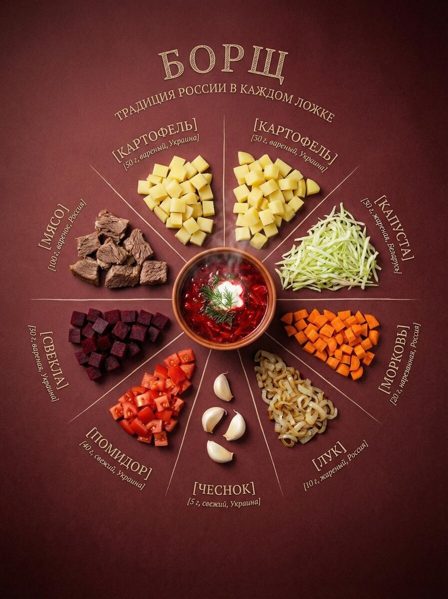 Инструкция: Для этого заходим в VeoSeeBot или на сайт, выбираем "Работа с изображениями", выбираем Nano Banana Pro и пишем промпт ниже: Все ингредиенты для [ПИЦЦЫ] выкладываются ровным слоем сверху вниз в идеальном радиальном порядке, каждый в виде отдельного куска пирога, расходящегося от центра. Секции разделены тонкими линиями, нарисованными от руки. Готовое [БЛЮДО] в [ПОСУДЕ] находится в центре, красиво оформленное и готовое на пару. Каждый ингредиент помечен по внешнему краю заглавными буквами с засечками и мелким курсивом внизу — "[ТЕСТО] / [100 г, выпеченное, Италия]", "[МОЦАРЕЛЛА] / [50 г, свежая, Италия]", "[ПОМИДОРЫ] / [30 г, свежие, Италия]", "[БАЗИЛИК] / [5 г, свежий, Италия]", "[ПЕРЕЦ] / [10 г, свежий, Турция]", "[ГРИБЫ] / [20 г, свежие, Франция]", "[ОКУНЬ] / [40 г, жареный, Италия]", "[ОЛИВКИ] / [15 г, черные, Испания]". Поверхность: [ЗЕЛЕНАЯ] крафт-бумага, слегка состаренная. Верхнее мягкое освещение, отсутствие резких теней, небольшая виньетка, смещающая фокус к центру