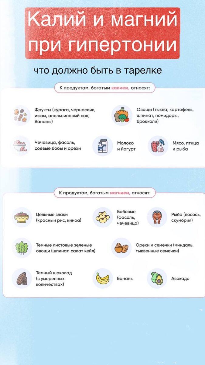 Правильное питание — это фундамент, на котором лекарства работают лучше, а давление становится послушнее. Особое внимание — двум минералам: калию и магнию. Они укрепляют сосуды, помогают сердцу биться ритмично и мягко снижают давление. 🥇 Калий: главный помощник Достаточное поступление калия с пищей может снижать давление на несколько мм рт.ст. и усиливать эффект терапии. Сколько нужно: 👩 женщины — 2700 мг/сут 👨 мужчины — 3400 мг/сут Где искать: курага, чернослив, бананы, картофель (запечённый в мундире), шпинат, брокколи, фасоль, чечевица, орехи, рыба, йогурт. 🥈 Магний: универсальный солдат Участвует в расслаблении сосудов, проведении сердечных импульсов и успокаивает нервы. Сколько нужно: 👩 женщины — 300 мг/сут 👨 мужчины — 400 мг/сут Где искать: шпинат, авокадо, киноа, гречка, фасоль, тыквенные семечки, миндаль, лосось, тёмный шоколад (от 75%). 🍽️ Примерный день: • Завтрак: овсянка с бананом и миндалём • Обед: запечённый лосось + салат из шпината с авокадо • Ужин: туш