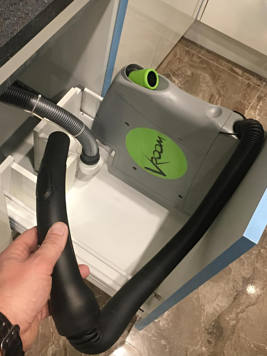 VROOM — это не отдельный пылесос, а **дополнительная опция к вашей центральной системе пылеудаления**. Она представляет собой компактный короб со встроенным растягивающимся шлангом, который монтируется в мебель или на стену в нужном месте.