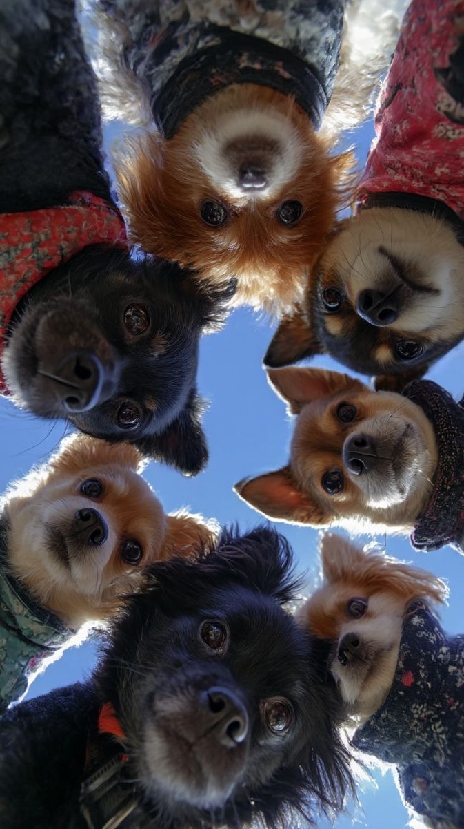 Viewed from a bottom - to - top angle, seven cute dogs form a circle. All the dogs are wearing cute and fashion cloths. The pupils of the dogs are all wide open. They exude a strong sense of cute. There are many breeds of dogs, big and small dogs, The background is a very blue sky. --chaos 30 --ar 9:16 --stylize 50 --draft #Нейросолнце@neo_neurosun #Midjorney