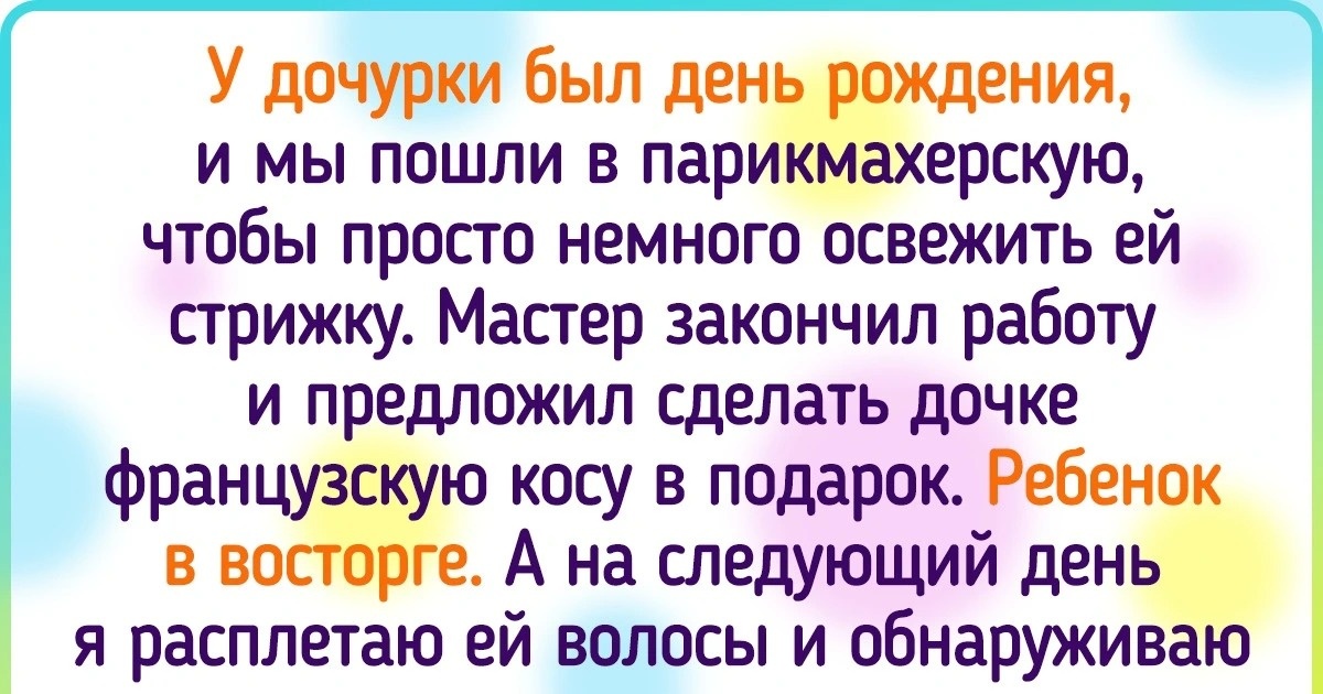 У дочурки был день рождения, и мы пошли в парикмахерскую, просто чтобы немного освежить ей стрижку. Мастер закончил работу и предложил сделать дочке французскую косу в подарок. Ребенок в восторге. А на следующий день я расплетаю ей волосы и обнаруживаю, что у нее весь затылок сострижен неровно. Пришлось идти ругаться в салон.