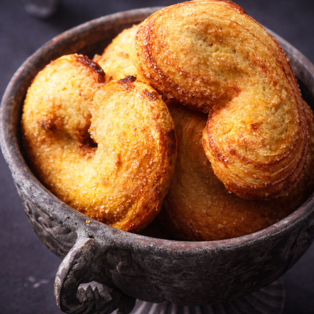 Муку, сливочное масло, соль вымесить насадкой «крючок», постепенно добавляя воду. Довести тесто до однородной массы, переложить на пергамент и убрать в холодильник на 1 час. Прослоить тесто маслом четыре раза по четыре слоя, убирая каждый раз в холодильник на 15 минут. Нарезать тесто толщиной 5–6 мм, сформовать ушки и посыпать смесью сахара с корицей. Запечь при температуре 180°С в течение 15 минут. Совет: