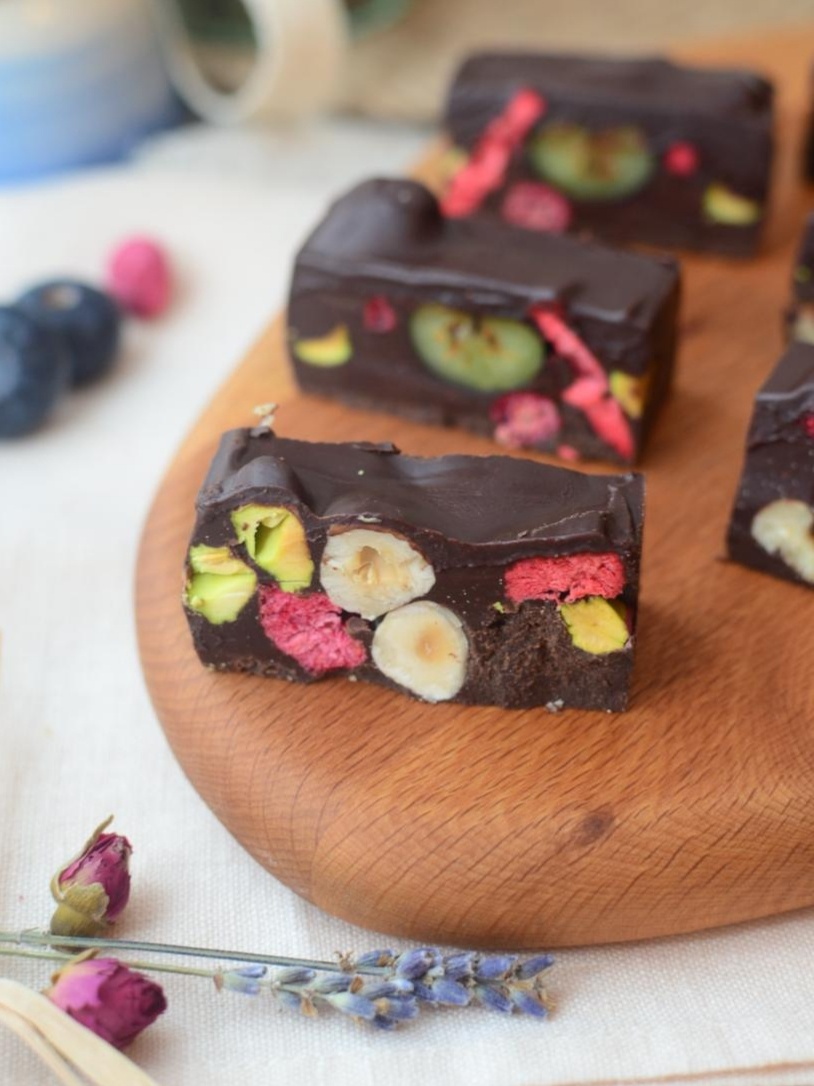 4. Сверху распределите орехи и ягоды, слегка утапливая их. Выложите ещё один слой ягод и орехов и покройте все оставшейся шоколадной массой.