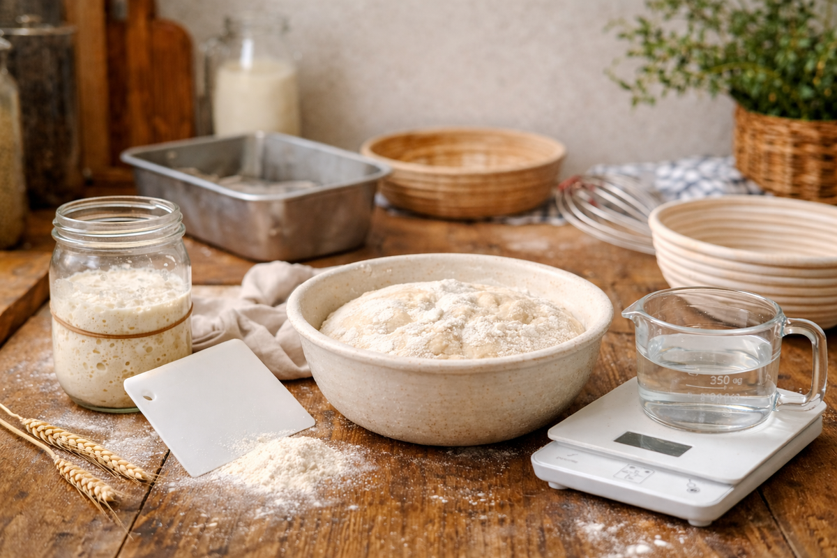 что вообще нужно, чтобы начать печь хлеб дома? Сейчас разберёмся спокойно и без лишнего. Начать можно очень просто. Для первого хлеба подойдёт обычная пшеничная мука высшего или первого сорта.