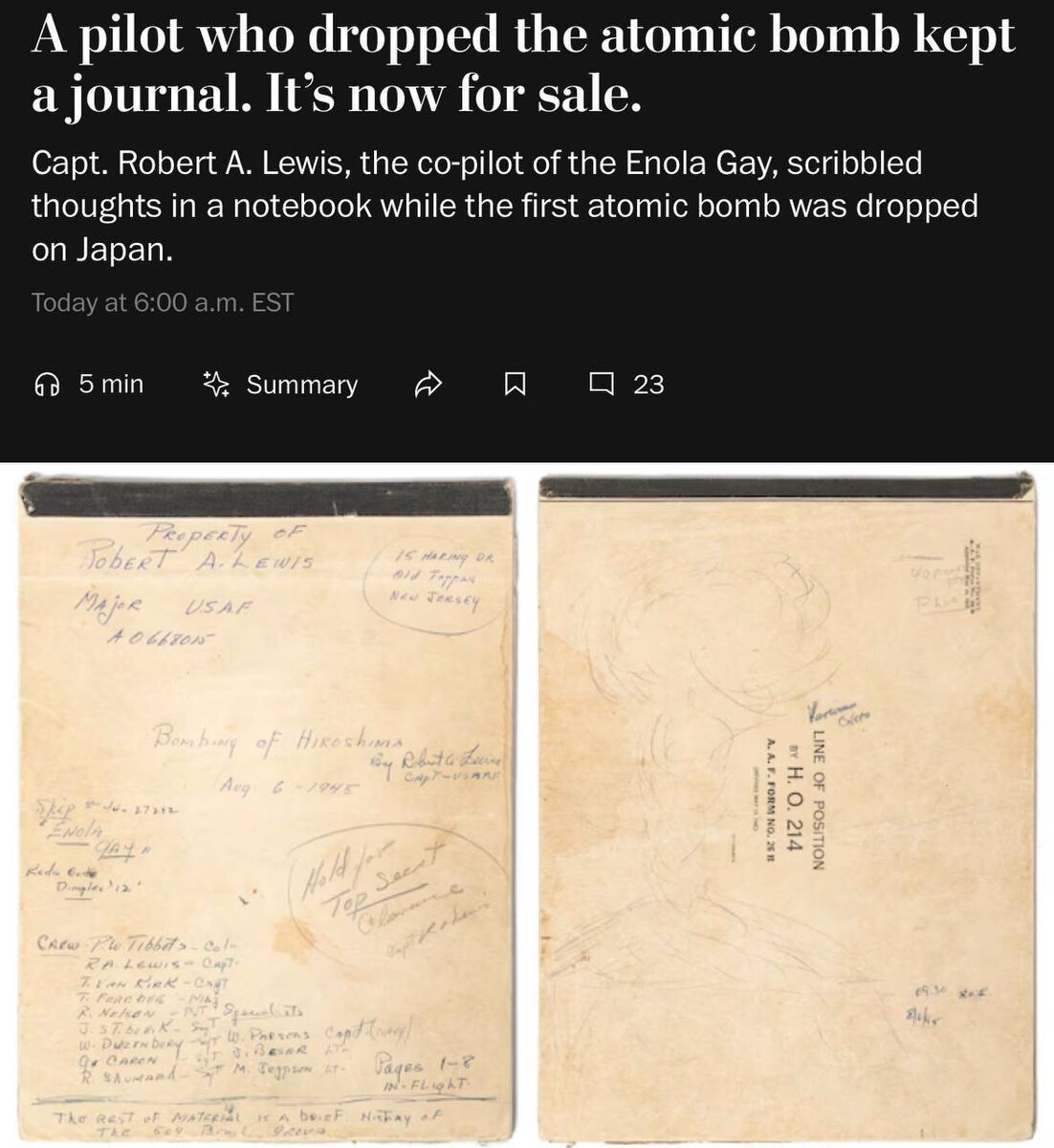 В 2022 году, дневник второго пилота бомбардировщика В-29 "Enola Gay", который сбросил ядерную бомбу на Хиросиму, был продан за 543к$.