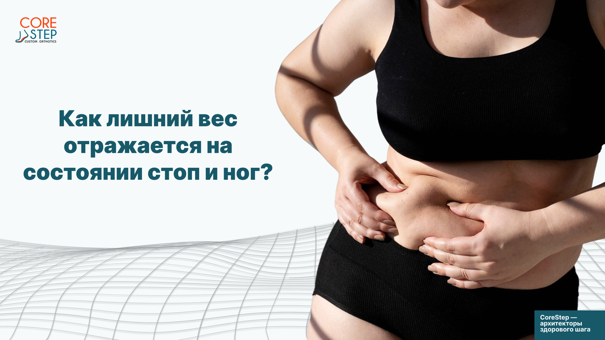 Стопа состоит из 26 костей, 33 суставов и более 100 мышц. Под воздействием избыточного веса её своды опускаются, связки перерастягиваются, развивается вторичное плоскостопие. В результате амортизационная функция нарушается, и нагрузка передаётся на голеностоп, колени, тазобедренные суставы и позвоночник.