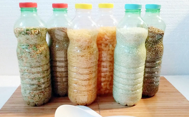 Я храню так гречку, рис, пшено и даже муку. Бутылки стоят в шкафу и не занимают много места.