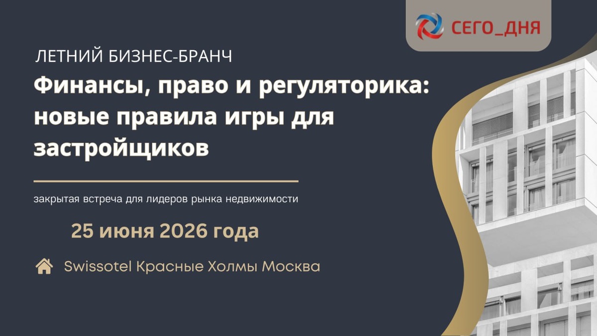 ⏺ 25 июня 2026 года, г. Москва ЛЕТНИЙ БИЗНЕС-БРАНЧ Финансы, право и регуляторика: новые правила игры для застройщиков Рынок недвижимости трансформируется на наших глазах. Изменение условий финансирования, новые законодательные инициативы и ужесточение регуляторного контроля требуют от лидеров девелопмента быстрых и выверенных решений. 25 июня 2026 года коммуникационный центр “Сего_Дня” приглашает заинтересованные стороны к закрытой бизнес-встрече “Финансы, право и регуляторика: новые правила игры для застройщиков”, которая соберет ключевых игроков рынка недвижимости России. О чем будем говорить без купюр: ⏺ как перестроить финансовые модели проектов с учетом жесткой кредитно-денежной политики; ⏺ как минимизировать риски и защитить бизнес: налоговые и правовые реалии; ⏺ каковы новые механизмы комплексного развития территорий (КРТ) и эффективного взаимодействия с регуляторами при реализации проектов. ⏺ Обсудим реальные кейсы, поделимся рабочими стратегиями и сформируем понимание того