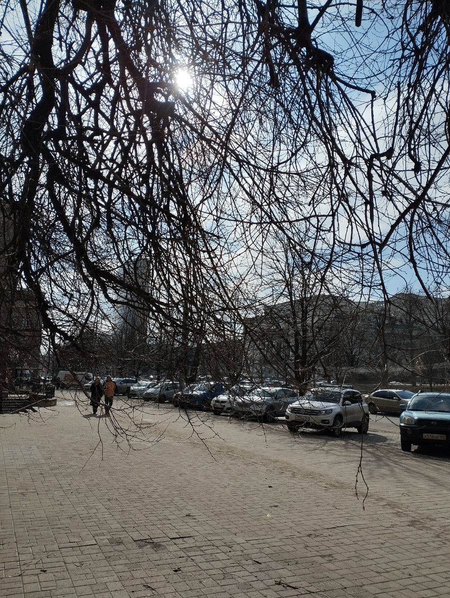Вокруг всё в солнечном свете выглядит особенно неприглядно. Кое-где остатки грязного снега, на тротуаре грязь, мусор, фасады домов давно накрашенные с осыпающейся штукатуркой, голые ветви деревьев.