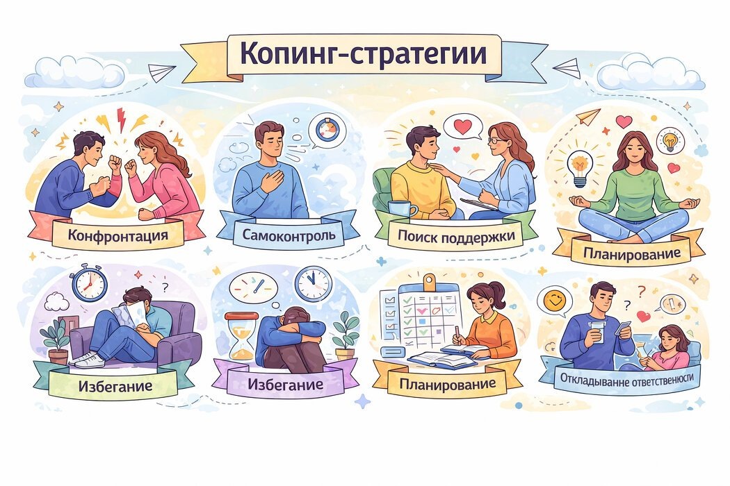 Стресс — часть жизни. Мы не можем исключить его полностью, но можем выбирать, как реагировать. Именно способы, которыми человек справляется с трудными ситуациями, называются копинг-стратегиями (от англ. coping — совладание). Таким образом, копинг-стратегии — актуальные ответы личности на воспринимаемую угрозу, а также способы управления стрессором. Выделяют две основные функции копинга (с точки зрения стрессо-ориентированного подхода). Первая, сфокусированная на проблеме, направлена на устранение стрессовой связи личности и среды. Вторая, сфокусированная на эмоциях, направлена на управление эмоциональным дистрессом. Обычно при преодолении стрессовой ситуации индивид использует обе названные функции. Проще говоря: что я делаю, когда мне трудно? Мы реагируем не столько на событие, сколько на его оценку.