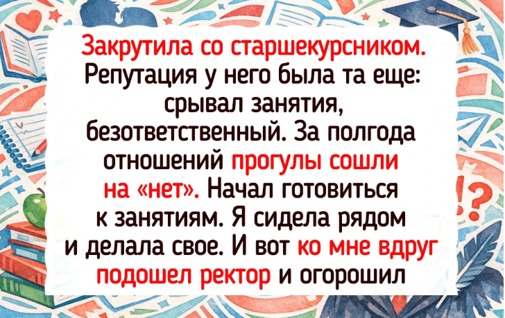 - Закрутила со старшекурсником. Репутация у него была та еще: срывал занятия, безответственный. За полгода отношений прогулы сошли на «нет». Начал готовиться к занятиям. Я сидела рядом и делала свое. И вот ко мне вдруг подошел ректор и огорошил: «Спасибо тебе, хоть кому-то удалось вразумить моего оболтуса, а то я уже вымотался с ним бороться». Так я внезапно выяснила, что встречаюсь с сыном ректора, и сразу же получила приглашение на семейный ужин.