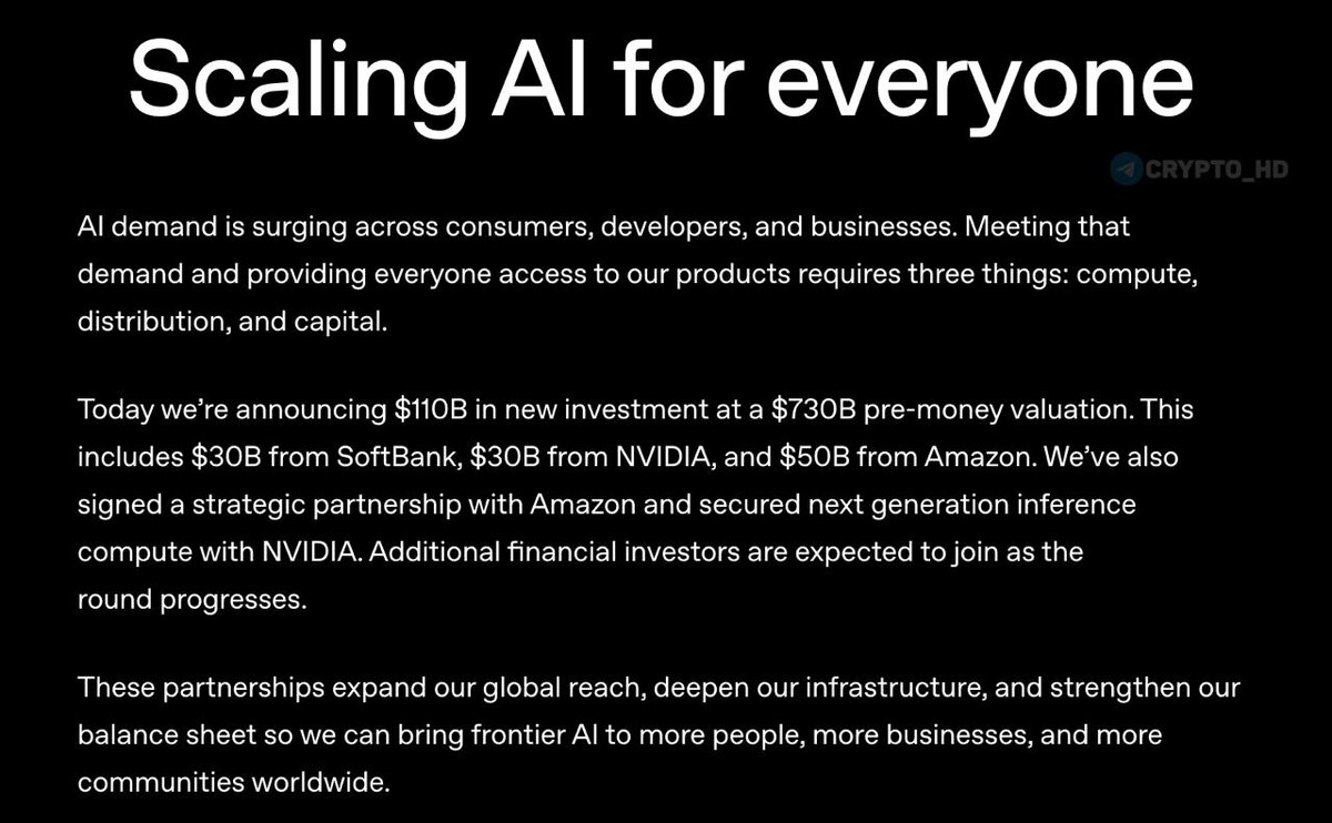 💸 В OpenAI привлекли $110b при оценке $730b — релиз Инвесторы – Amazon ($50b), SoftBank ($30b) и Nvidia ($30b). Кроме того, разработчик ChatGPT начнет использовать AI-чипы Trainium от Amazon и потратит еще $100b на услуги Amazon Web Services (AWS) в течение 8 лет. ❗️Дополнительно: В OpenAI работают над возможной сделкой между Anthropic и Пентагоном США. Ранее в Anthropic отклонили «финальное предложение» Минобороны, заявив, что их AI-технологии не должны использоваться для массовой слежки и автономного оружия. Ранее: OpenAI сливает данные? Crypto Headlines