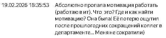 ➡️ Четвертый вопрос от подписчика Абсолютно пропала мотивация работать (работаю в IT). Что это? Где и как найти мотивацию? Она была! Её потерю ощутил после прошлогодних сокращений коллег в департаменте... Меня не сократили. ✅ Мой ответ Давайте сразу к делу. Вы спрашиваете «что это» и «где искать мотивацию». Отвечу по порядку. Что это. Это два состояния, которые наложились друг на друга: 1⃣ Отложенная реакция на стресс 2⃣ Синдром выжившего Мой развёрнутый ответ по ссылке: ➡️ Отложенное выгорание: почему мы «ломаемся» после того, как всё закончилось Рубрика: #ваши_вопросы Ваш психолог @Al1514a ⚜️ ⚜️⚜️⚜️⚜️⚜️⚜️⚜️⚜️