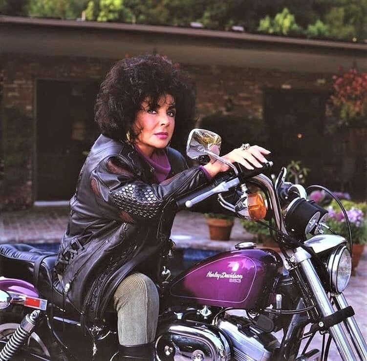 "Королева Голливуда", актриса Элизабет Тейлор (27 февраля 1932 - 23 марта 2011) в компании одного из богатейших людей своего времени, издателя Малкольма Форбса, который подарил ей мотоцикл Harley Davidson в цвет ее глаз.