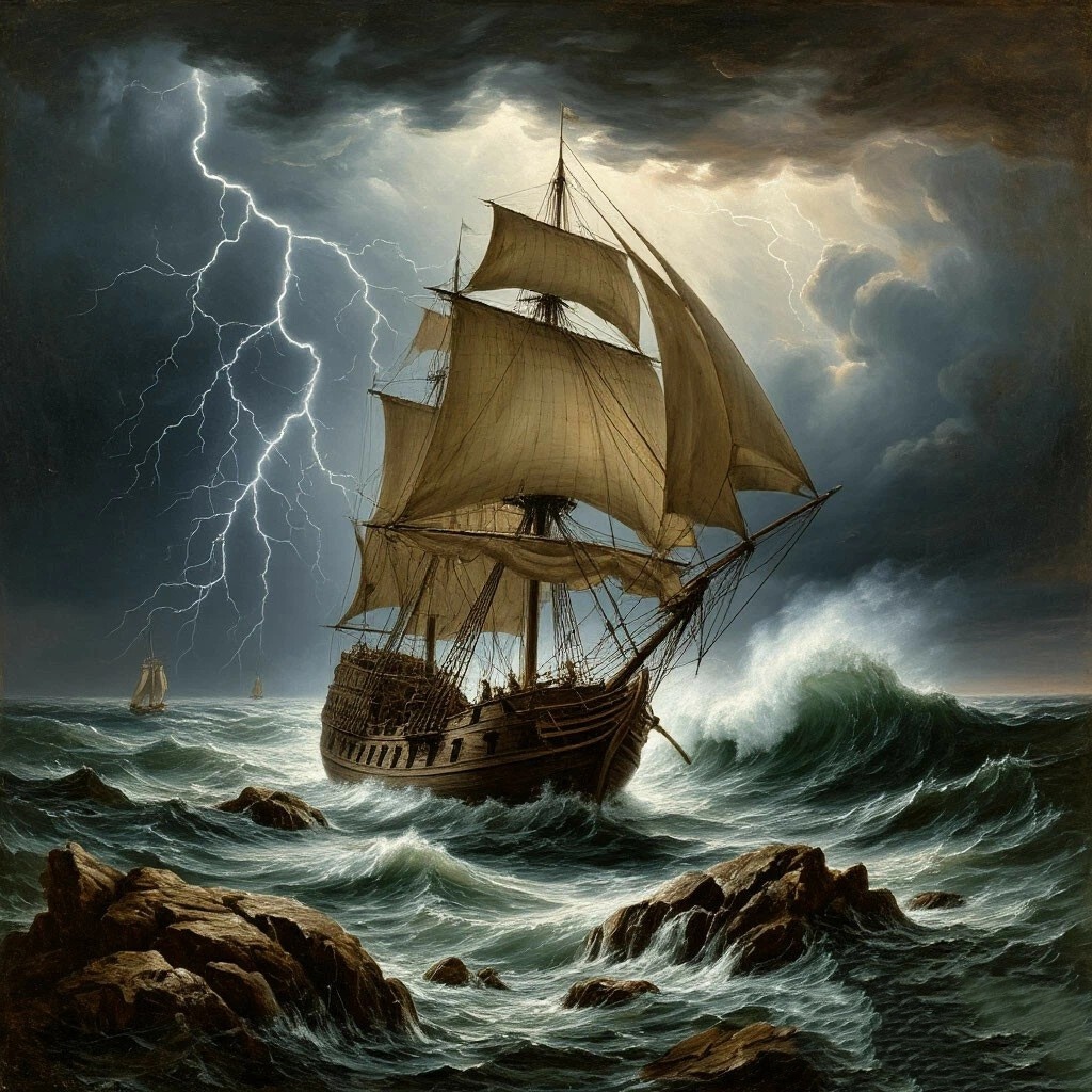 К вечеру небо наливается свинцом. Ветер крепчает, срывая пену с волн. Штурман вглядывается в очертания берега, но в сгущающейся тьме ориентиров не видно. Адмирал Албукерки приказывает убрать паруса, но поздно — шторм налетает внезапно, с яростью, какая бывает только в этих широтах.
