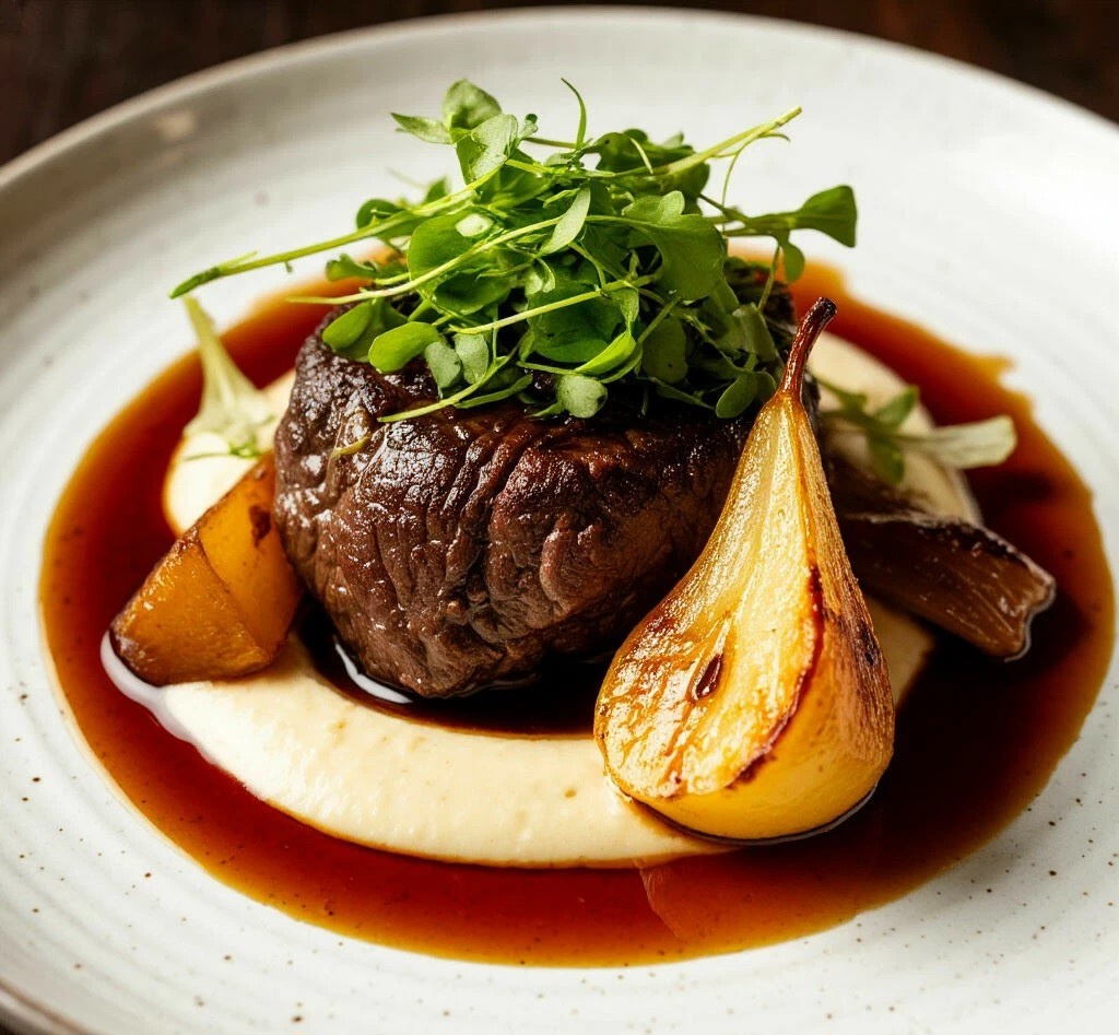 Это блюдо — настоящая симфония. Нежная, жирная говядина встречает сладковатую земляную ноту топинамбура, а кисло-сладкая груша и насыщенный винный соус расставляют финальные акценты. Это стоит того, чтобы провести на кухне пару часов.