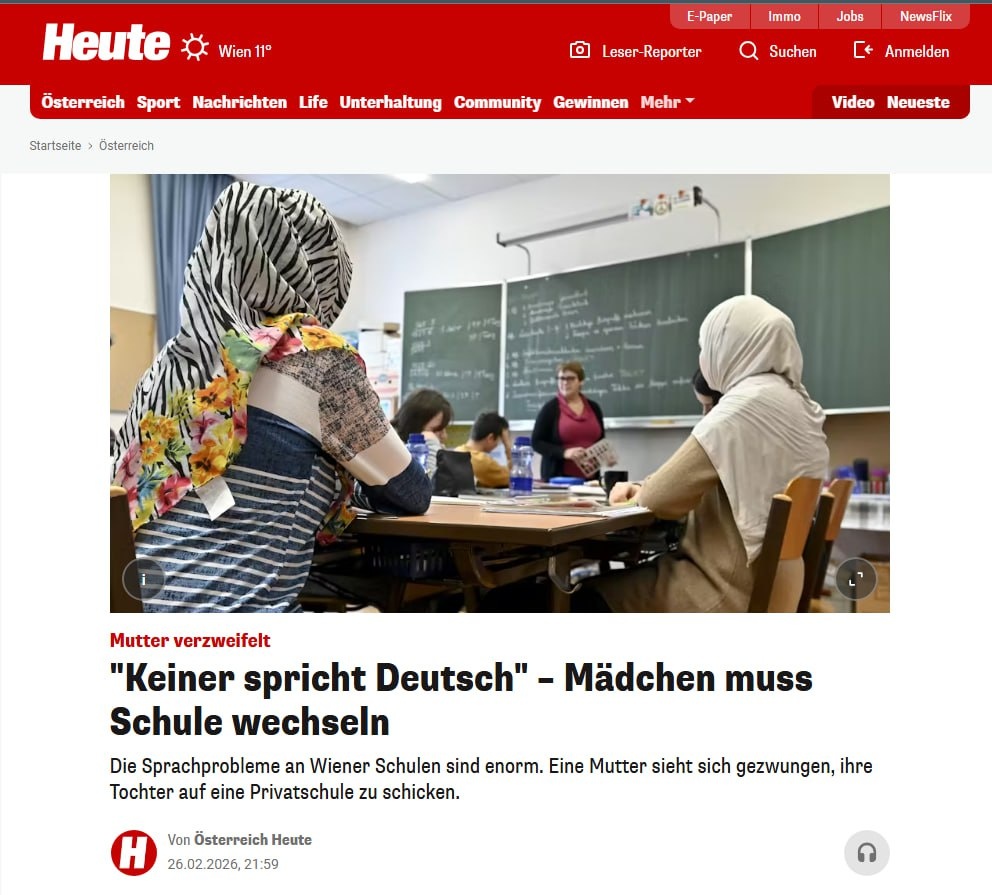 Австрийские родители все чаще забирают детей из школ из-за «снижения академических стандартов» в обучении немецкому. Например, как пишет Heute, жительница Вены Сабина Г. забрала из школы свою дочь Лену, потому что в ее классе только четыре ученика бегло говорят по-немецки. Кроме вопросов образования, Сабина была озабочена тем, что после общения с одноклассниками Лена отказывалась есть свинину и носить «некоторые виды летней одежды». Как же до такого дошло?🤔 👍«БайБайден» в МАХ
