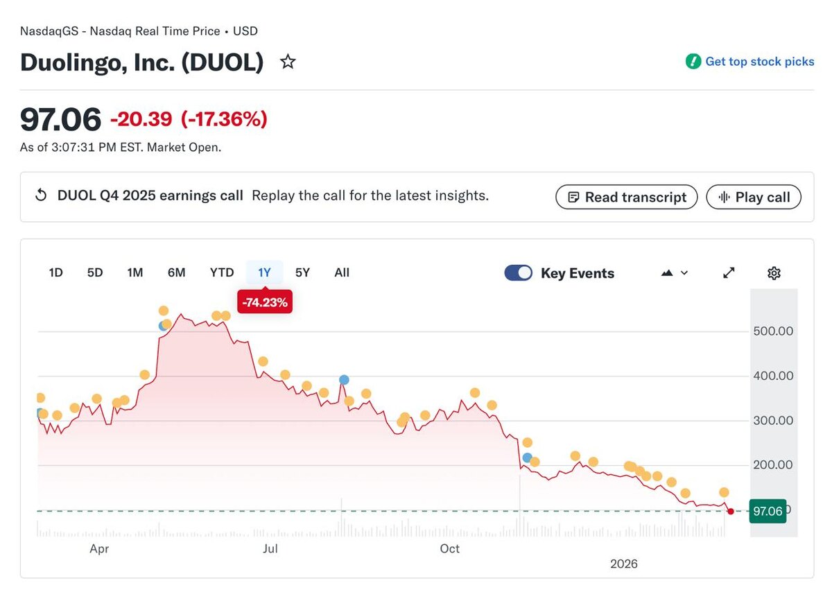 Акции Duolingo стремительно летят вниз, после того, как компания объявила об инвестициях в ИИ.