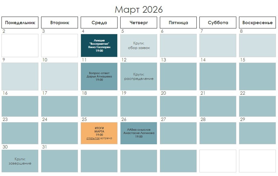 ⏺ 4 марта, 19:00 — лекция «Восприятие» с Ниной Гаспарян ➡️для подписчиков «Секреты мастерства» ⏺ 11 марта, 19:00 — вопрос-ответ с Дарьей Атнашевой ➡️для подписчиков «Сила сообщества» ⏺ 25 марта, 19:00 — итоги месяца, обсуждаем прогресс работы над книгами, тренируем питчинги ➡️открытая встреча ⏺ 26 марта, 19:00 — открывает свои двери ЛАВка смыслов Анастасии Логиновой ➡️открытая встреча В течение месяца работают круги взаимопомощи, где авторы получают отзывы на свои работы. Приходите в клуб, у нас хорошо 🌟 #расписание