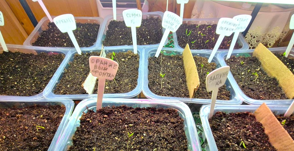 22 февраля посеяла семена томатов, перцев, баклажанов и некоторых цветов. Об этом есть отдельное видео. Посаженные семена были помещены на небольшой стеллаж с подсветкой на веранде. Дневная температура в помещении составляла 22-24 гр., ночная - 18гр. Посевы подсвечивались 14 часов (с 8 утра до 10 часов вечера). На пятый день взошло большинство сортов томатов. В этой статье делаю небольшой обзор тех сортов, которые взошли дружно и тех, которые пока не взошли. Дружнее всех взошли томаты сорта "Санька". Семена мои. Очень люблю этот сорт. Он низкорослый, скороспелый и очень лёжкий. Красные помидоры долго висят на кустах и не портятся, можно снимать постепенно, по мере потребления. Имеют хороший товарный вид. Вкусовые качества не особо выдающиеся, но точно лучше, чем магазинные. Дают обильные урожаи каждый год. Неплохо взошли новые для меня сорта: Ракета, Алтайский богатырь, Орлиное сердце, Клубничный черри, Сомма и Мамонтёнок. Сеяла по 3-4 семечка. Появились петельки у таких сортов, как Бы
