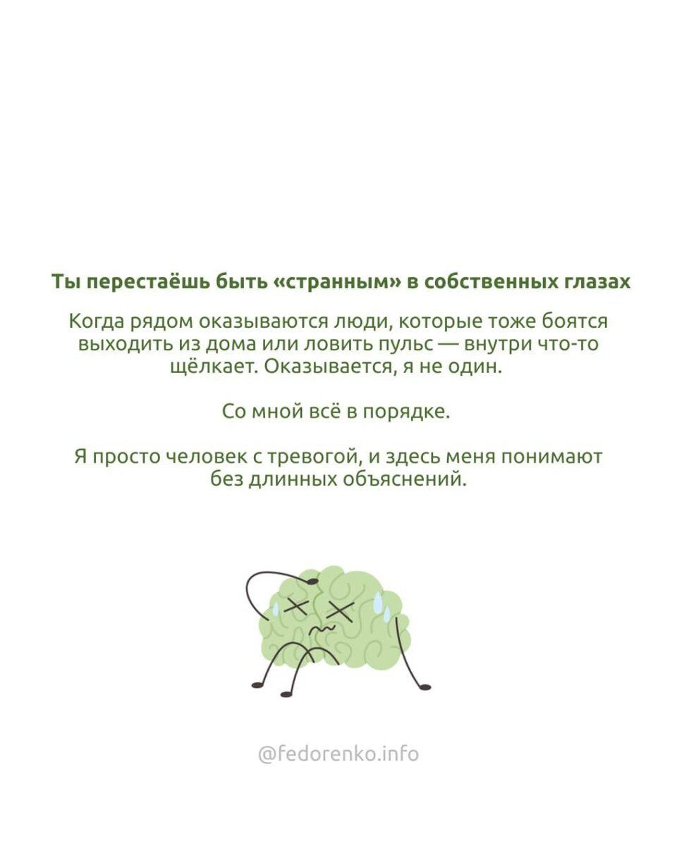 Ты и специалист. Кабинет. Диалог. Но есть другой формат. Более живой. Более человечный. Тот, в котором ты вдруг обнаруживаешь: я не один. И это меняет всё. Группа. И дело не только в поддержке (хотя её там будет много). Мы собрали 7 неочевидных, но очень тёплых причин, почему стоит однажды решиться — листайте карточки ➡️ 🌿 А если вы уже чувствуете: «мне это нужно», — в клинике продолжается набор на групповую терапию. Места ещё есть. Ведущая — Наталья Викторовна Бородина, КПТ-терапевт, нейропсихолог, дефектолог. И человек, который прошёл через панические атаки и ГТР сам. Она не просто знает механизмы тревоги — она чувствует их изнутри. Это даёт особенную глубину и безопасность. Программа — пошаговая, понятная, научно-доказанная КПТ терапия: — разбор механизма тревоги — работа с катастрофическими мыслями — поведенческие эксперименты — снижение избегания — устойчивость к неопределённости Формат: 4 встречи (раз в неделю по 2 часа) + закрытый чат поддержки. Стоимость: 1 час — 1100