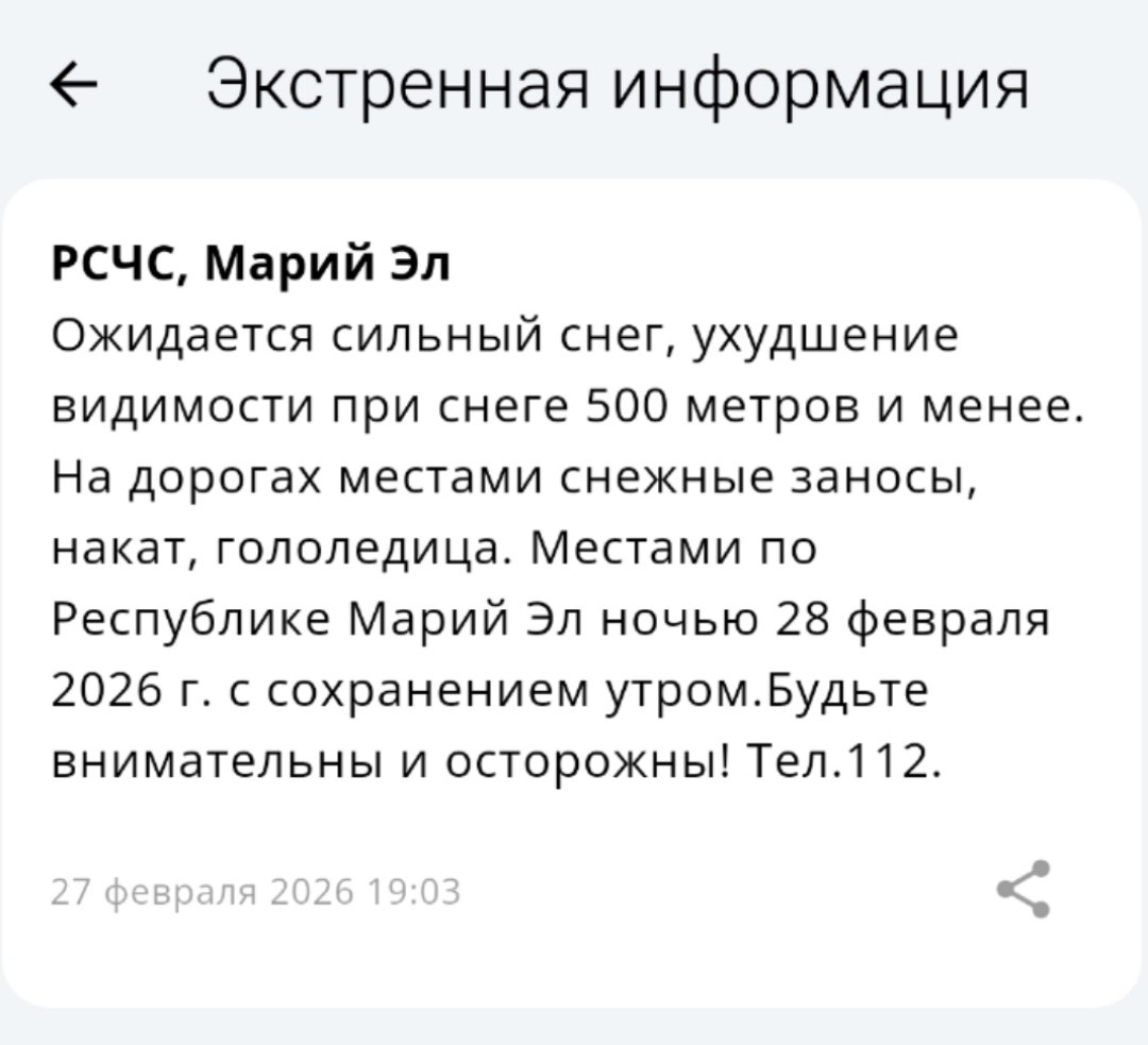 По данным регионального управления РСЧС, ночью 28 февраля (с сохранением утром) в республике ожидается сильный снег. Видимость на дорогах ухудшится до 500 метров и менее. На трассах возможны снежные заносы, накат и гололедица. 📲 Подписывайтесь на «МП» в МАХ