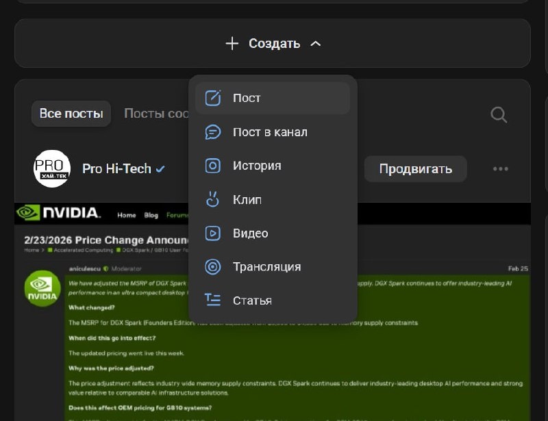? VK переделали интерфейс на ПК и теперь публикация поста требует еще один дополнительный шаг. Сначала нужно навести курсор на Создать, затем обязательно передвинуть курсор ниже, и только после этого можно нажать на Пост, чтобы сделать Пост. Почему нельзя было оставить создание Поста по клику сразу на плюсик с выбором дополнительных опций onmouseover - эргономическая загадка. Но, настоящий эргономический ад начинается, когда прикладываешь к посту вертикальное видео. Система выкидывает тебя со страницы сообщества на редатор шортов, при этом по окончании Пост с видео все же делается на стену, но описание не прикладывается к Посту, а остается атрибутом лишь видео. И нужно еще раз копировать и вставлять текст сопровождения уже к посту на стенку. Поддержки разметки для текста в Постах и возможности вставлять ссылки красивенько как в Телеге добавлено не было. Такая функциональность у Вк исключительно для Статей. Но, Статья это не Пост. Статья это другое.