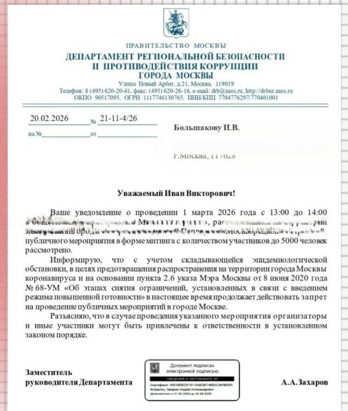 ⚡️Мэрия Москвы запретила митинг в поддержку Telegram из-за «эпидемиологической обстановки и ковидных ограничений» — НОВОСТИ МИРА