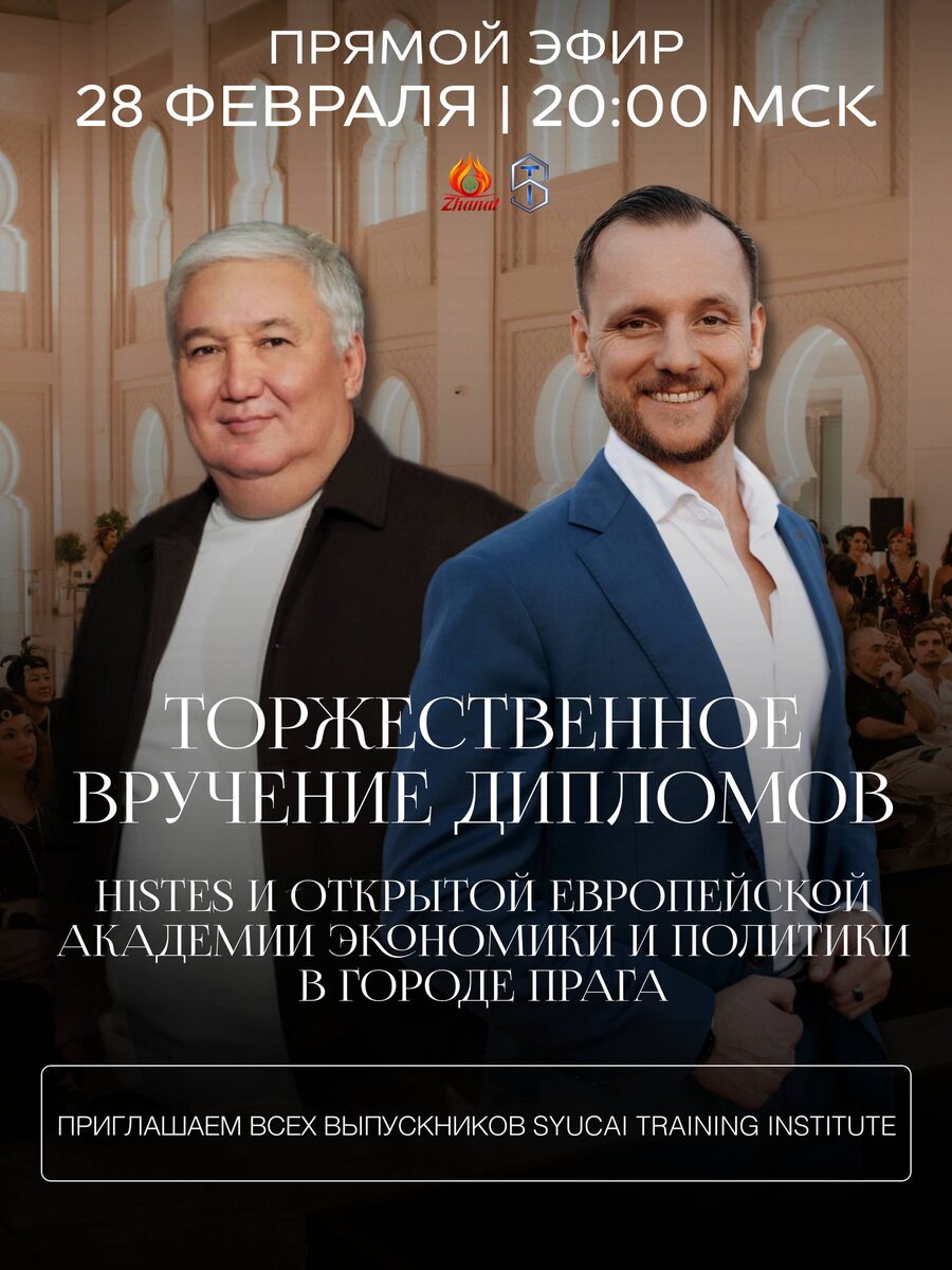 Друзья, 28 февраля в 20:00 пройдет прямой эфир, посвященный грандиозному событию — торжественному вручению дипломов в Кайзерштейнском дворца в г. Прага! Прямой эфир для вас проведут два ярких спикера: 👤 Сергей Теплых — Генеральный директор Syucai Training Institute 👤 Кадырбекулы Мырзадильда — Президент международной ассоциации «ZHANAT COACH» На эфире мы ответим на вопросы: ✅ Как поучаствовать в торжественном вручении дипломов после обучения в Syucai Training Institute ✅ Приглашение гостей на мероприятие ✅ Стоимость, бронирование и другие организационные вопросы Эфир состоится уже завтра в 20:00 МСК, присоединяйтесь! 📲 Эфир пройдет в Instagram: http://instagram.com/sergei_teplykh