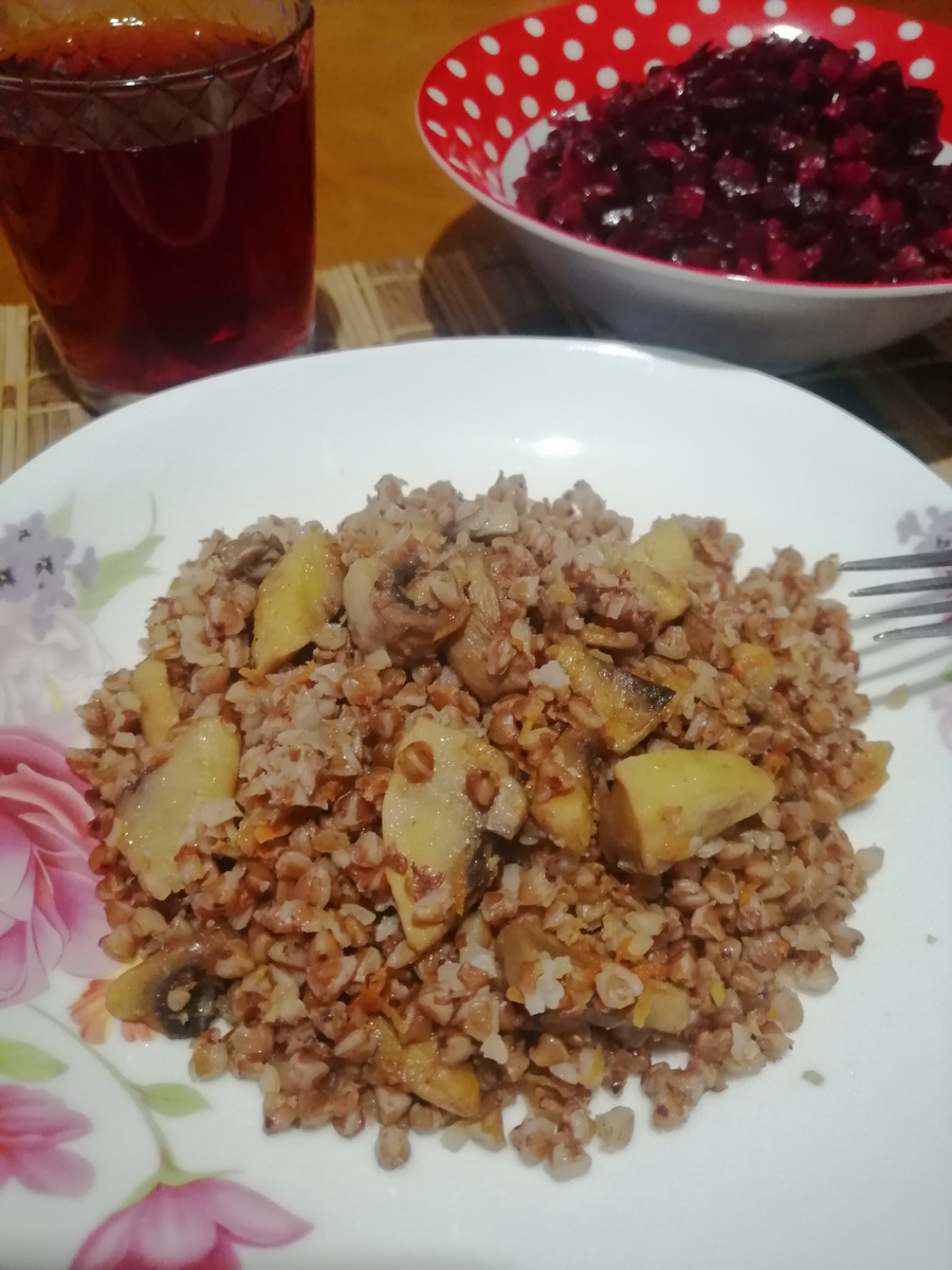 Напитаемся вкусной гречкой с грибами и лёгким салатиком со свеклой и солёными огурчиками.