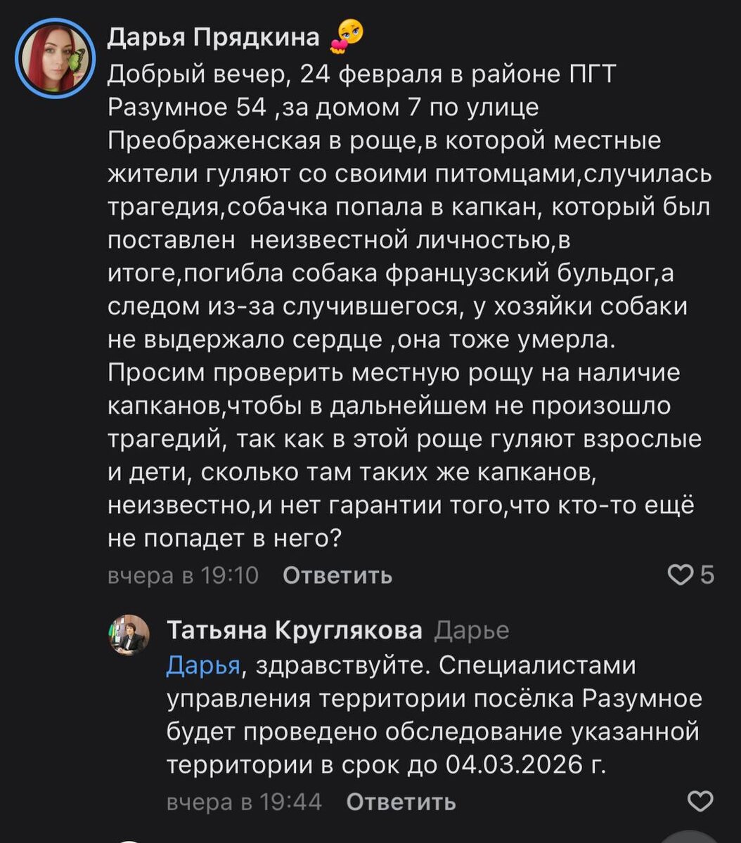 Трагедия произошла 24 февраля в роще за домом №7 на улице Преображенской. Французский бульдог погиб в капкане, установленном неизвестными. По словам местных жителей, после этого у хозяйки собаки остановилось сердце. О случившемся сообщили в комментариях к посту губернатора. Глава Белгородского округа Татьяна Круглякова поручила обследовать территорию, где произошёл инцидент, до 4 марта. ❕ Жесть Белгород - подписаться