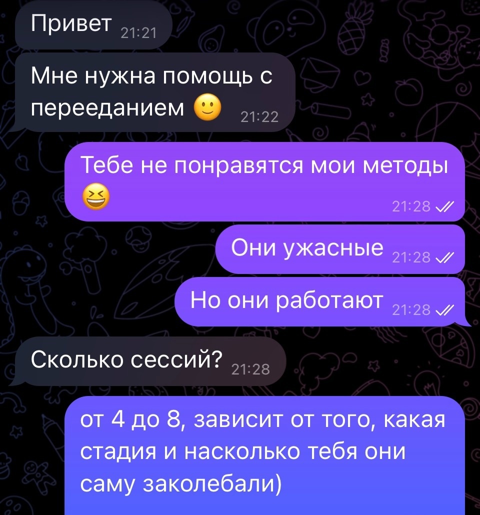 К. написала мне в личные сообщения в мессенджере 1,5 месяца назад, в начале января: «Мне нужна помощь с перееданием».