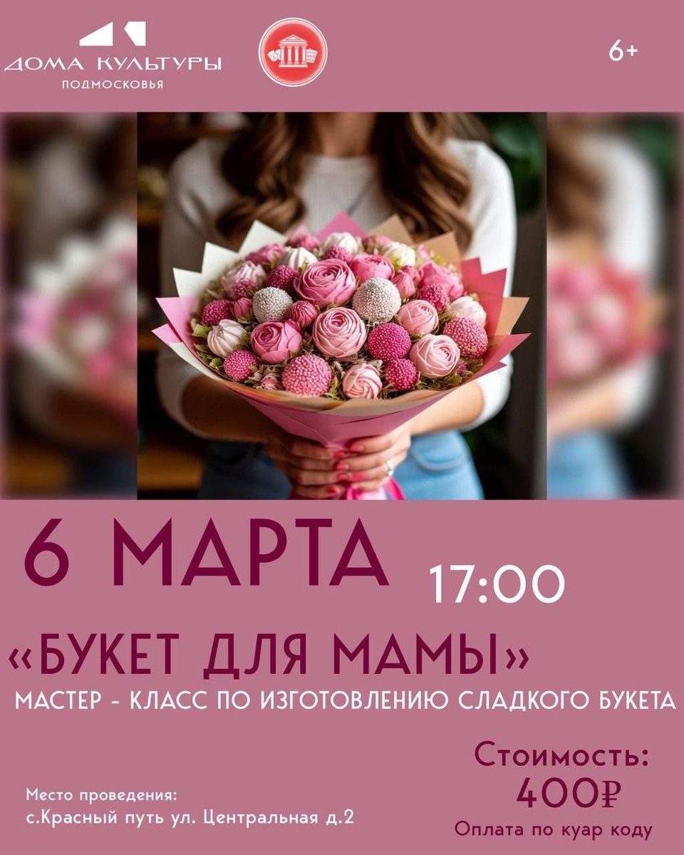 ✨ СДК «Русь» приглашает 💐💐💐💐💐💐💐💐💐💐 «Букет для мамы» - мастер - класс по созданию сладкого букета. 💐💐💐💐💐💐💐💐💐💐 Удивительный, вкусный и красивый букет станет чудесным подарком для мамы или бабушки. 💐💐💐💐💐💐💐💐💐💐 Все материалы для мастер - класса предоставляются. 🚫 Возраст: 6+ 📆 06.03.2026🕒17:00 🏢 Сельский дом культуры (СДК) «Русь» 📍 г.о.Домодедово, с.Красный Путь, ул.Центральная, д.2 💰 Цена: 400 ₽ ✅ Мероприятия Домодедово https://dzen.ru/id/66f10385cc4c5a16f7b5fb02 http://vk.com/domodedovo_events http://dzen.ru/domodedovo_events