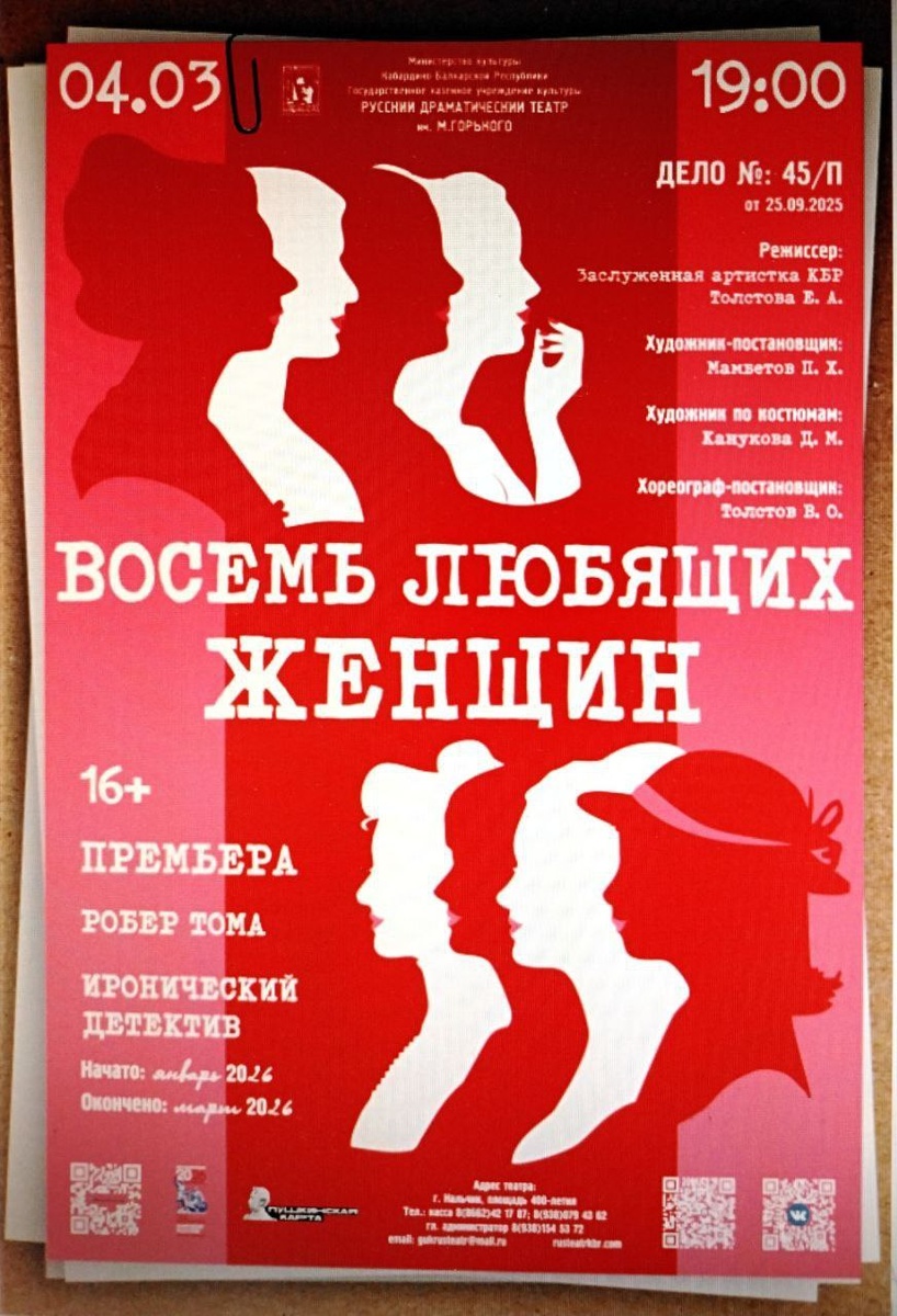 Русский драматический театр им. М. Горького в лице режиссера Евгении Толстовой готовит к выпуску свою новую постановку - спектакль "Восемь любящих женщин" известного французского драматурга Робера Тома. В центре сюжета — неожиданное убийство главы семьи, произошедшее на заснеженной вилле, отрезанной от внешнего мира. Это происшествие нарушает идиллическую атмосферу, в которой дамы трех поколений и домочадцы решили провести Рождество в кругу близких. Театр приглашает зрителей и гостей республики стать свидетелями того, как эти женщины, связанные родственными узами, пытаются разобраться в сложной паутине семейных отношений. Их цель — выяснить, кто же совершил преступление. Зрителей ждёт захватывающий сюжет, неожиданные повороты, интриги, французская музыка и калейдоскоп ярких женских образов, которые не оставят равнодушным никого. Дата и время показа: 4 марта, 19:00. Место проведения: г. Нальчик, пл. им. 400-летия (здание Музыкального театра). Касса, тел.: 88 662 42 17 87 или (+7) 938 0